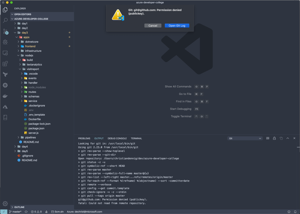 As you can see in the git logs, it says “Permission denied (publickey)”. This is odd, because VS Code is using the same git executable as the commandline (see the log output).