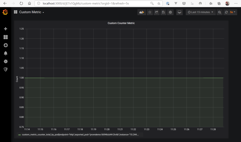 As we can see here, the application reports a current value of “1” for the custom metric (custom_metric_counter_total_by_pod).