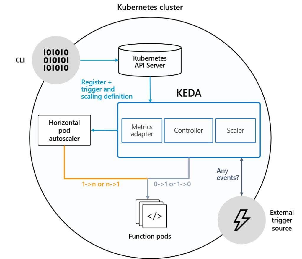KEDA, under the hood, works like the many other projects in this area and – first and foremost – acts as a “Custom Metrics API” for exposing metrics to the Horizontal Pod Autoscaler. Additionally, there is a “KEDA agent” that is responsible for managing / activating deployments and scale your workload between “0” and “n” replicas (scaling to zero pods is currently not possible “out-of-the-box” with the standard Horizontal Pod Autoscaler – but there is an alpha feature for it).